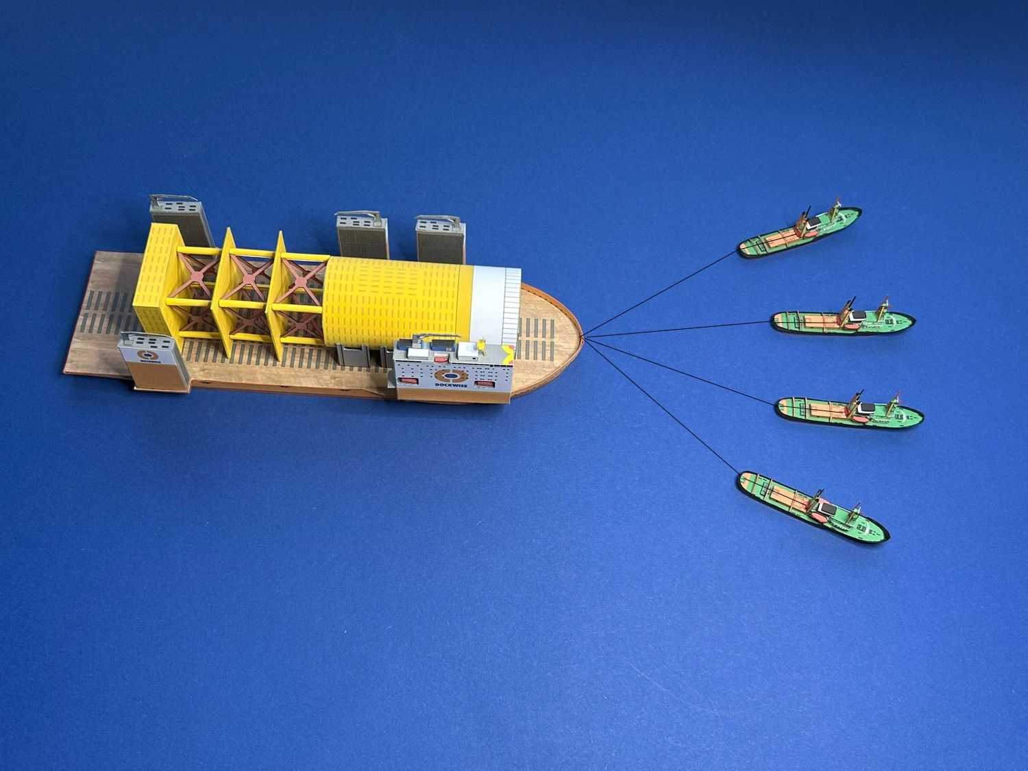 The fourth photo shows one possible use of the four tugs with the transport ship DOCKWISE VANGUARD and its cargo. The DOCKWISE VANGUARD is not included.