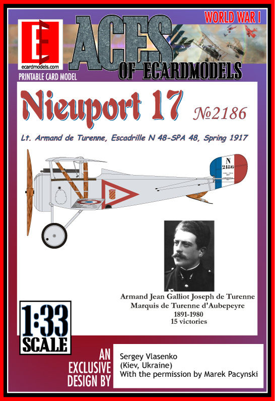 This paper model builds a Nieuport 17 for the Aces of Ecardmodels Series. This aircraft was flown by Lt. Armand de Turenne flying with Escadrille N48-SPA48 during the Spring of 1917. Lt. de Turenne achieved 15 victories.