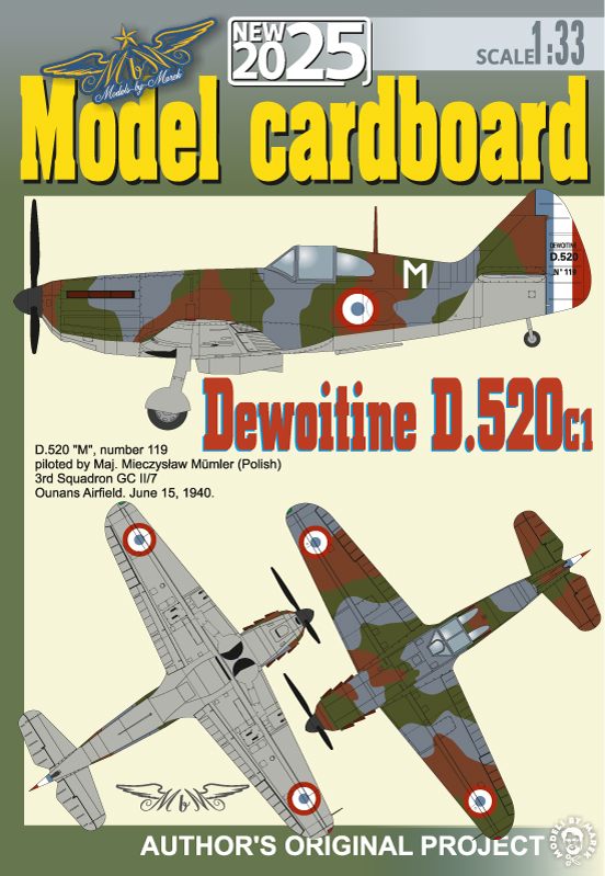 This paper model builds the Dewoitine D.520C1 in service with the 3rd Squadron GC II/7. The aircraft identified by White M and serial 119 was flown by Polish Maj. Mieczyslaw Mumler from Ounans Airfield June 15, 1940.