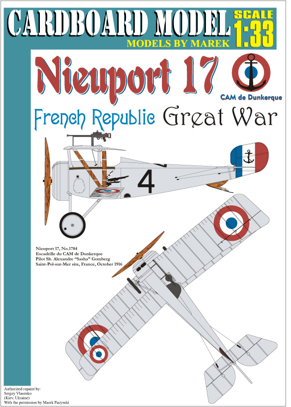 This repainted paper model, originally designed by Marek, builds the Nieuport 17 Serial Number 1784 which was assigned to Escadrille du CAM de Dunkerque. This aircraft was piloted by Slt. Alexandre “Sasha” Gomberg while flying from Saint-Pol-sur-Mer site in France during October 1916.