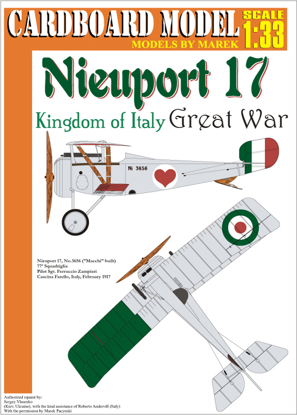This paper model builds a Nieuport 17 aircraft, serial 3656, flying with 77 Squadriglia during February 1917. This aircraft was flown by Sgt. Ferruccio Zampieri