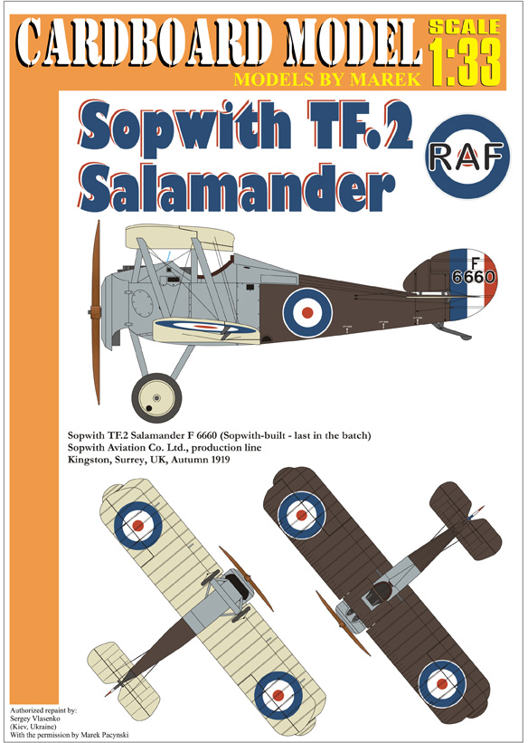 This paper model builds the Sopwith TF2 Salamander built by the Air Navigation Co., Ltd., serial number F6660 as it rolled off the production line in Kingston, Surrey, UK in Autumn 1919.