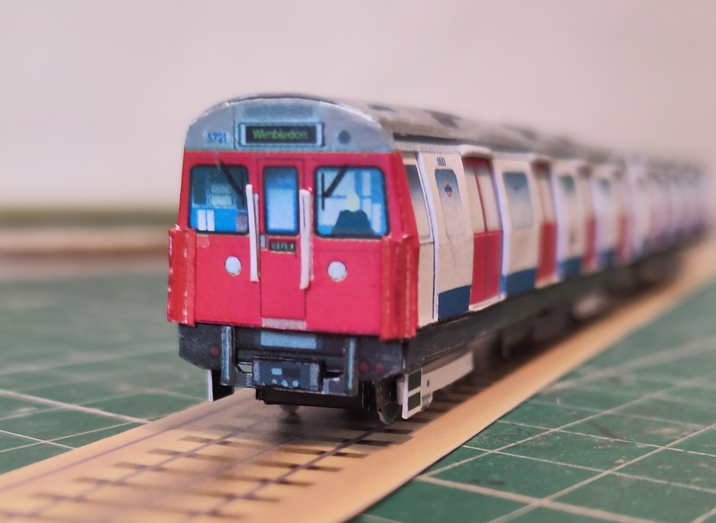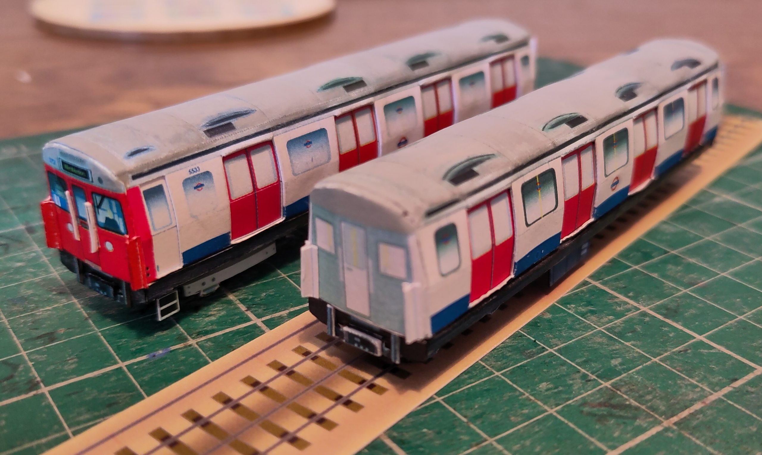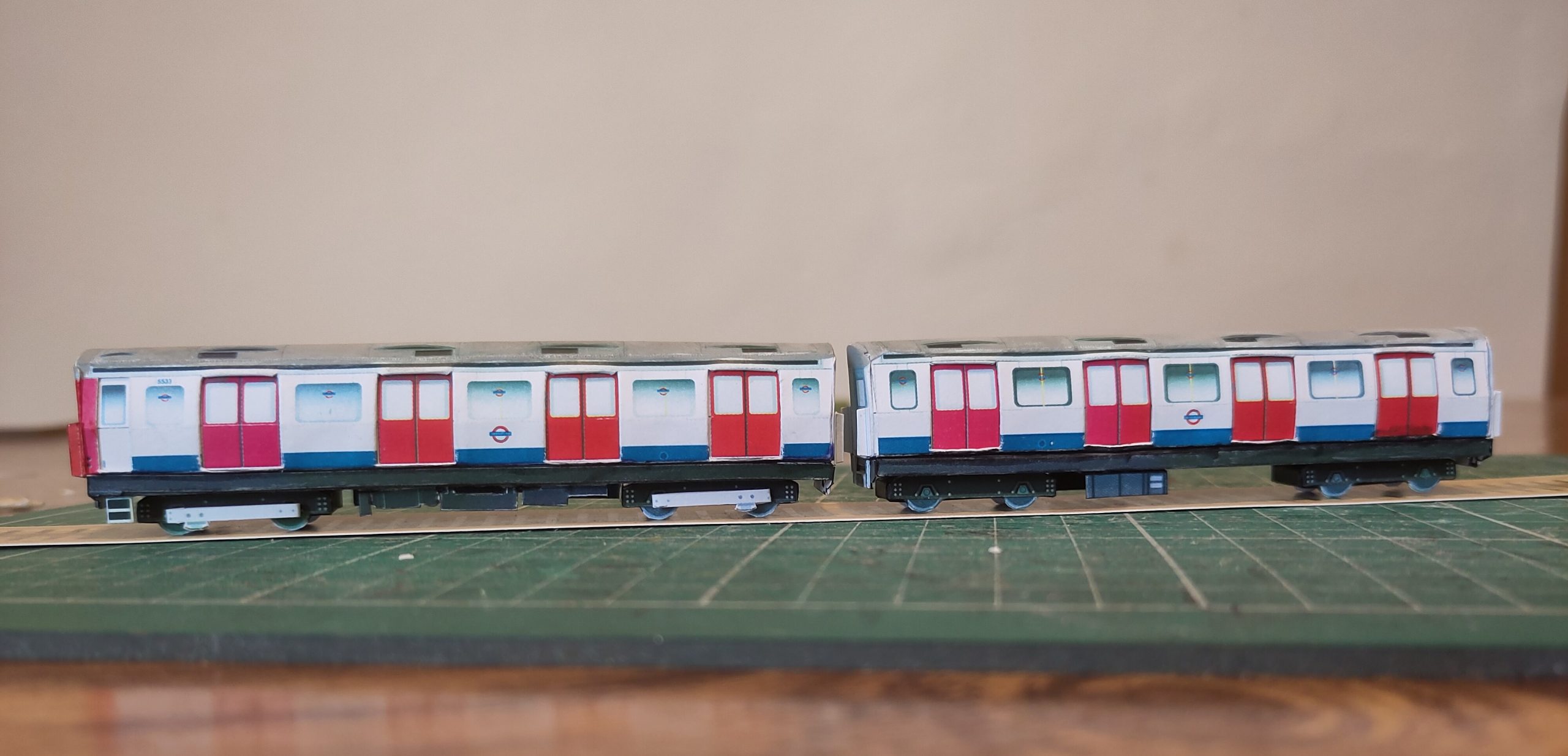 1:148 N scale model of a London Underground ‘C’ Stock train in refurbished white, red and blue as applied from the 1990s. The C stock was built in two batches in 1969 and 1977 and was operated on the Circle, District and Hammersmith & City lines in London.